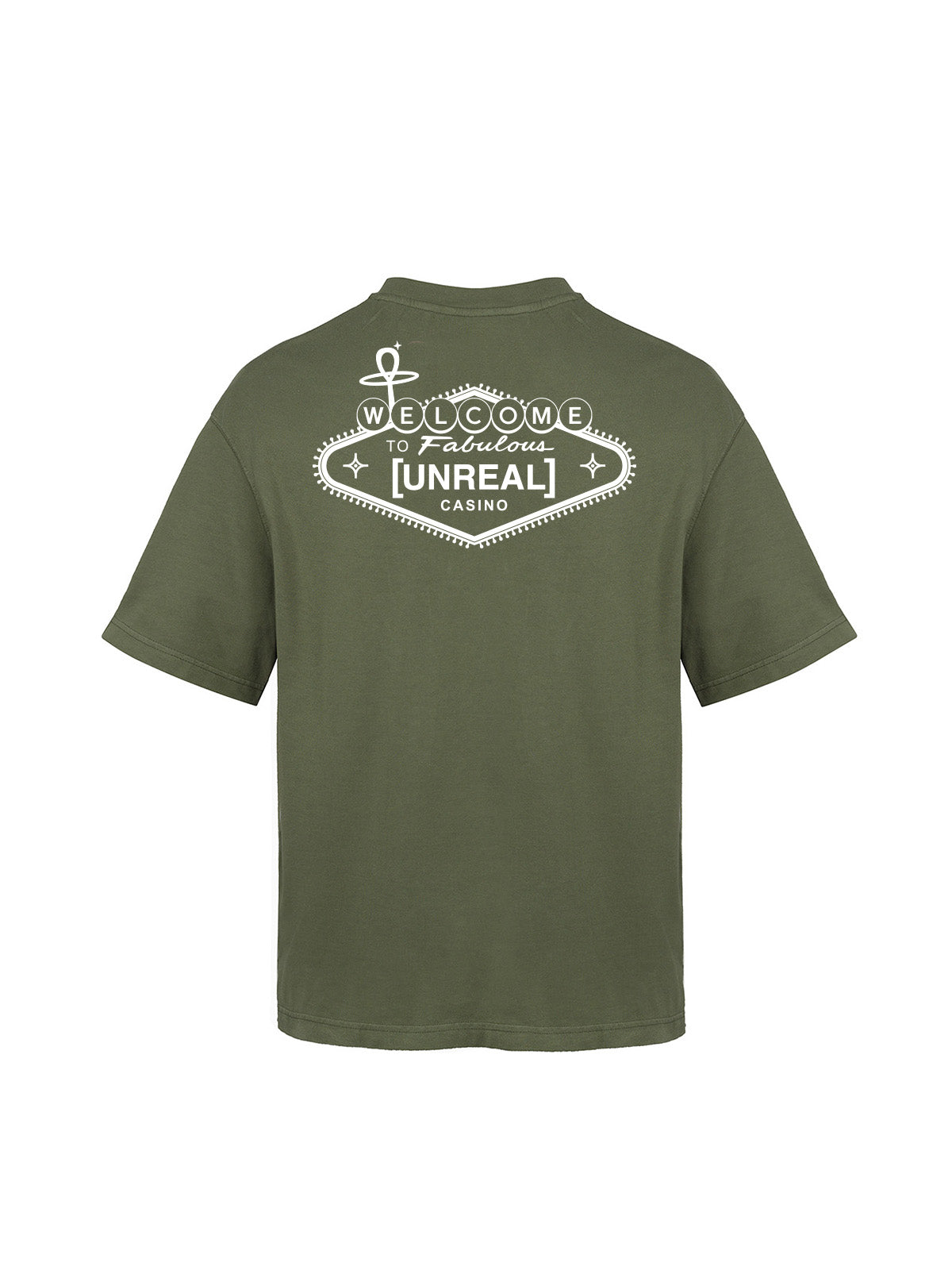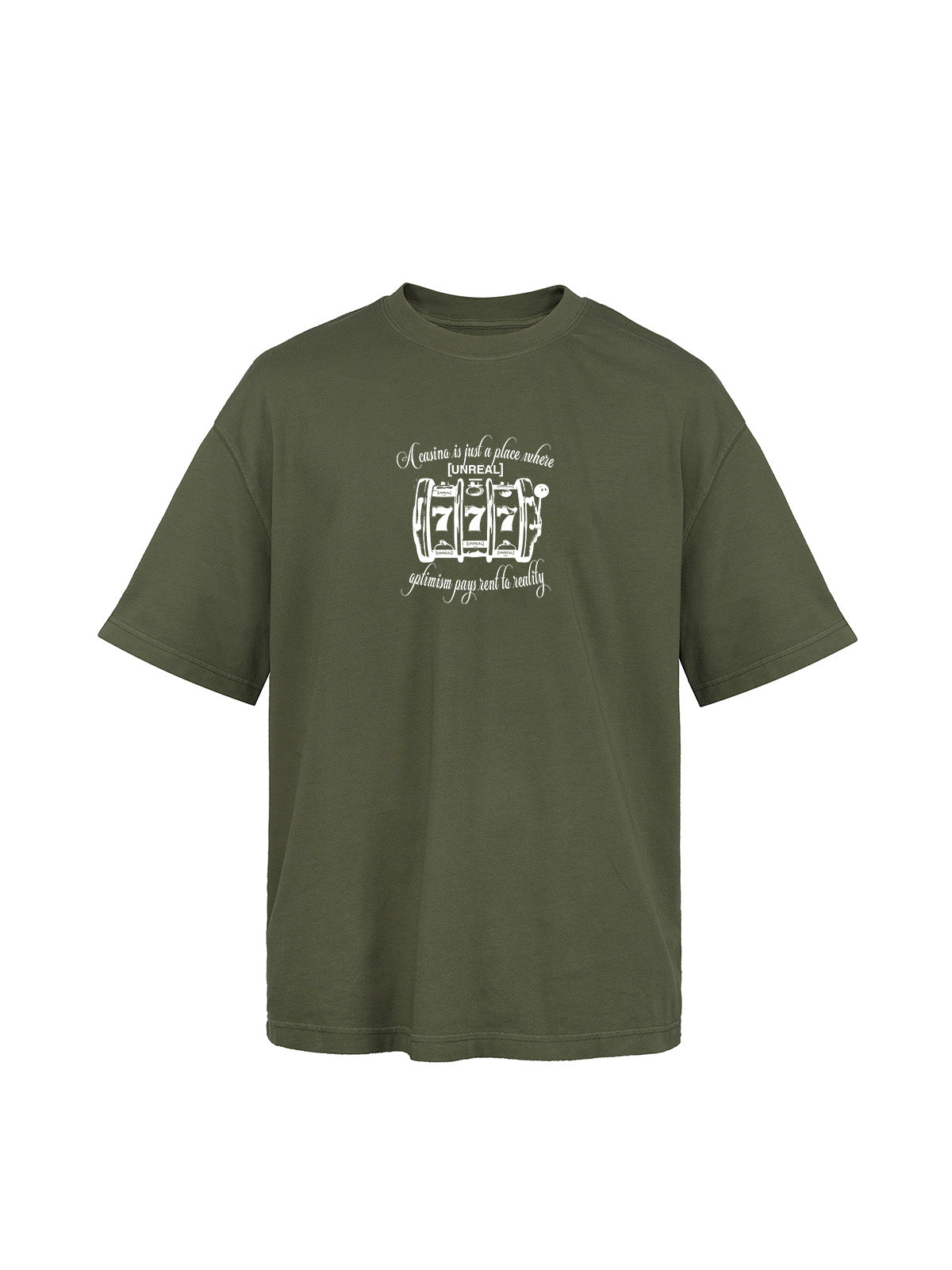 Ez a póló mindent elmond – egyedi tervezésű nyerőgép előlapi grafika tripla hetes motívum és hátoldali nyomat, amely üdvözöl a „Fabulous [UNREAL] City”-ben.