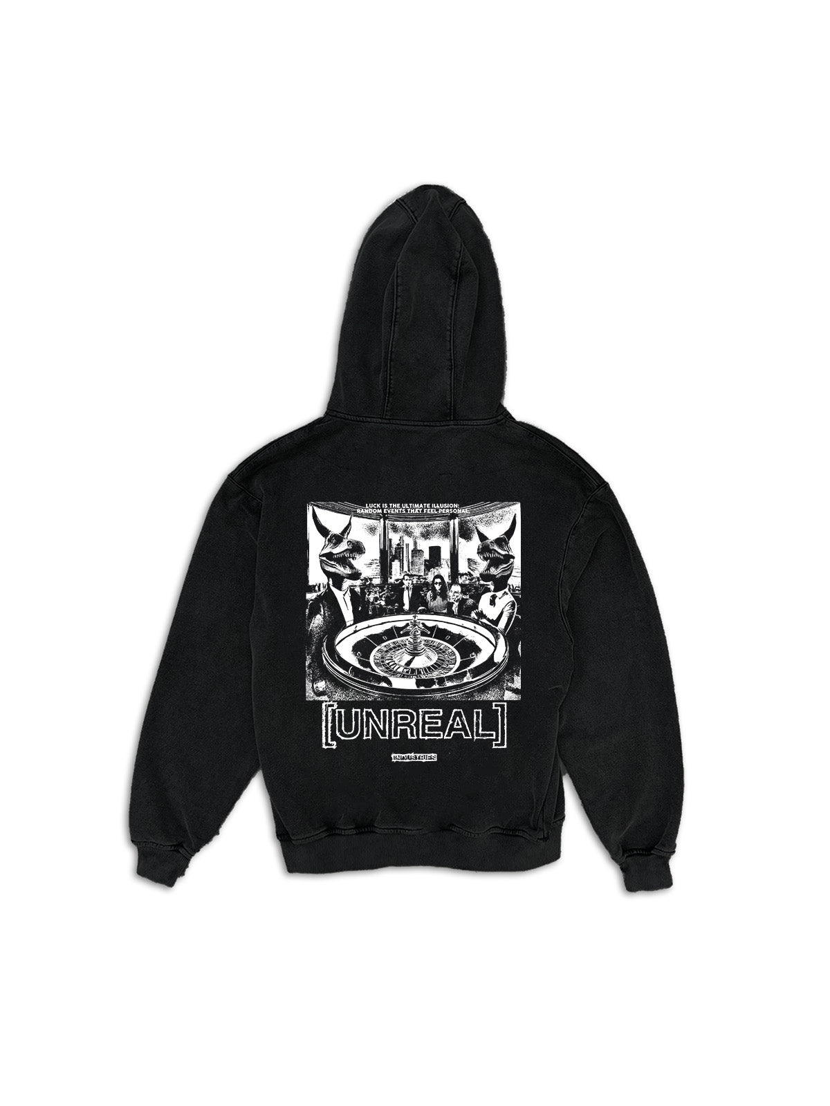 A kapucni nyomtatott, fordított L[U]CK grafika, amely a szerencse fogalmát egy állásfoglalássá formálja.
