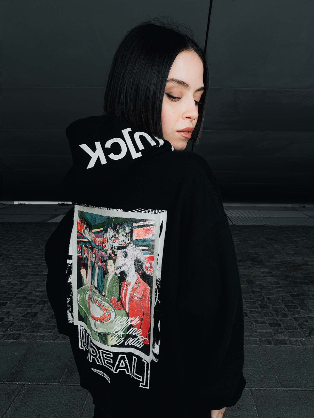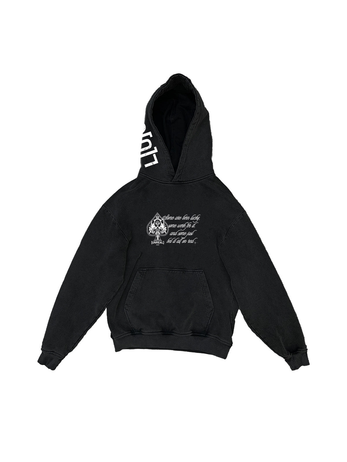 A kapucni nyomtatott, fordított L[U]CK grafika, amely a szerencse fogalmát egy állásfoglalássá formálja.