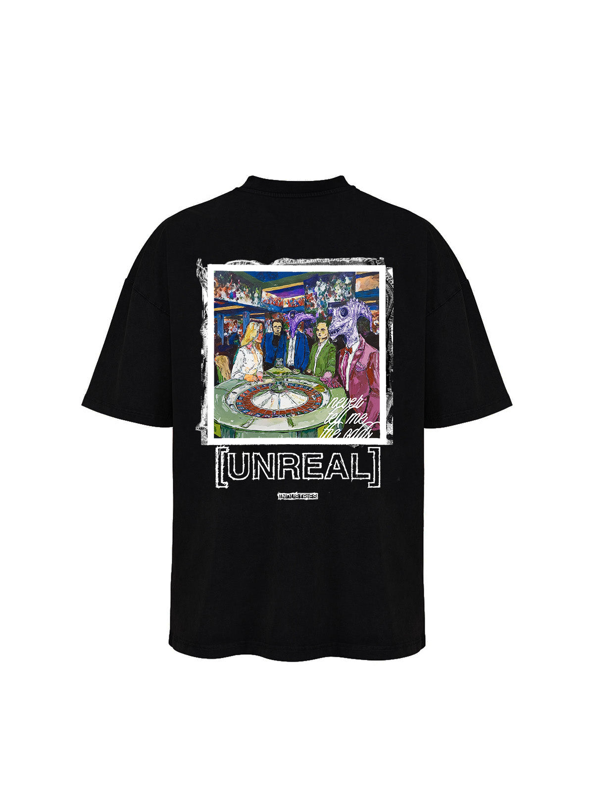 Az [L[U]CK] kaszinó póló egy szürreális rulett jelenetbe repít, a hátoldalán kontrasztos színekkel nyomtatva – torz játékosok, merész színösszeállítások és egyetlen mélyreható vonal: