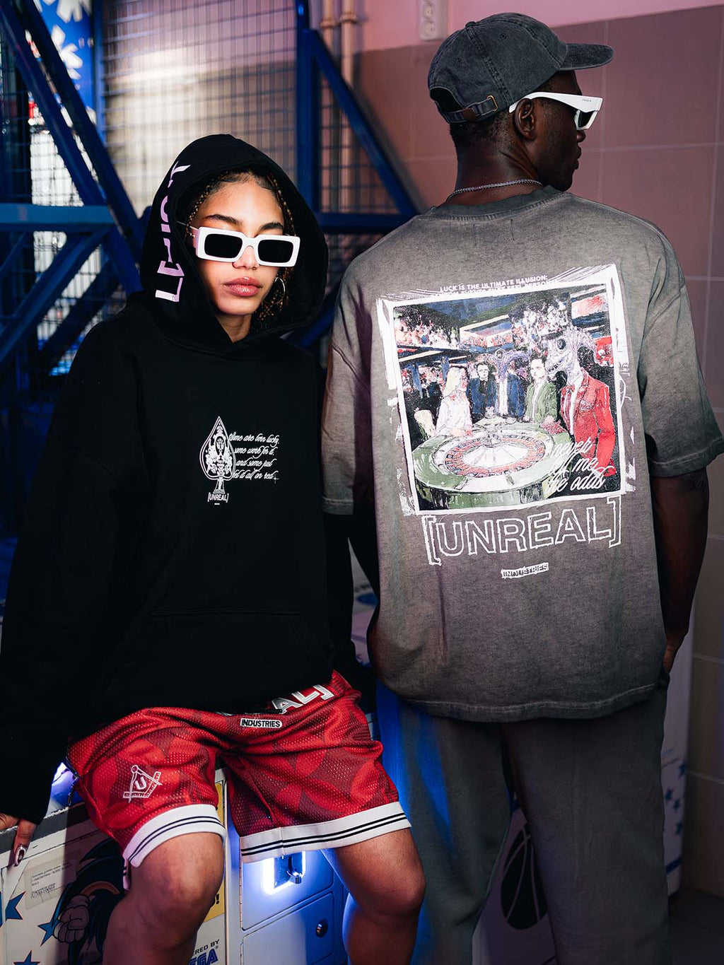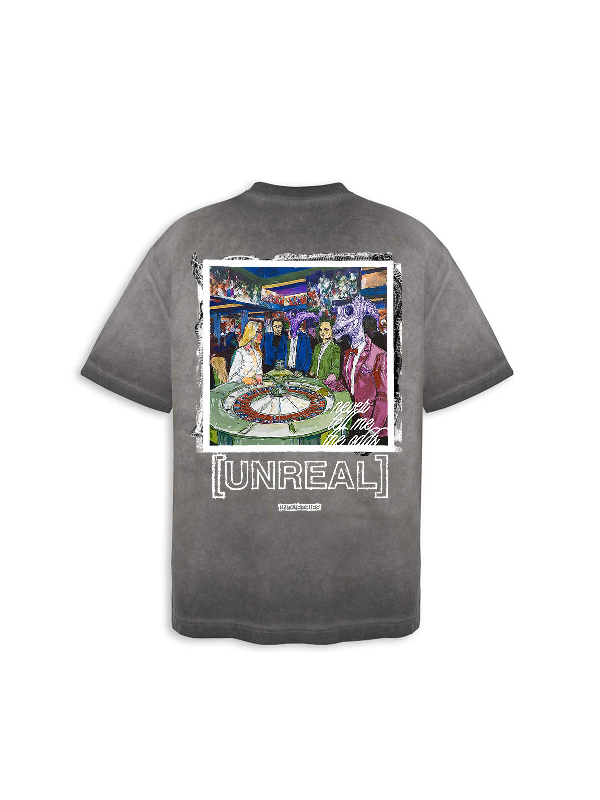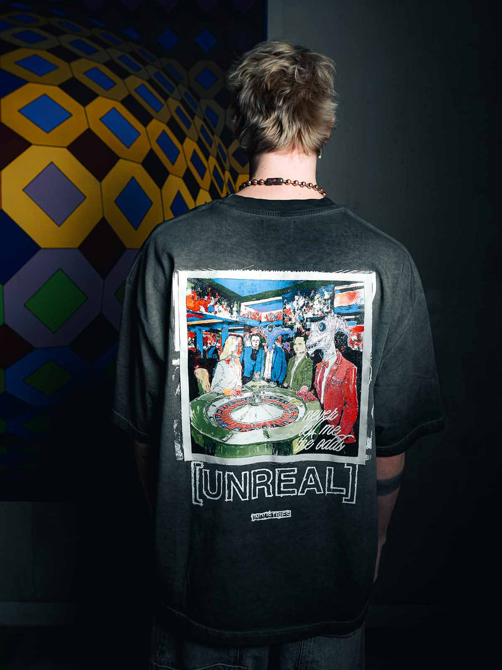 Az [L[U]CK] kaszinó póló egy szürreális rulett jelenetbe repít, a hátoldalán kontrasztos színekkel nyomtatva – torz játékosok, merész színösszeállítások és egyetlen mélyreható vonal: