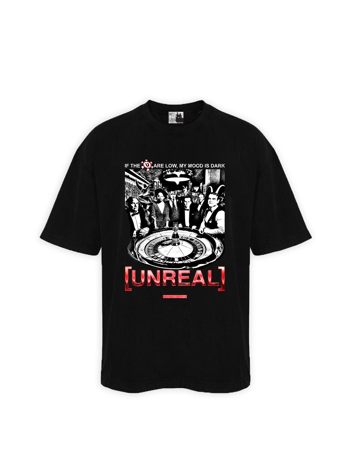 The [UNREAL] logo hits loud across the front, while the back carries a clean typographic print: L[U]CK — tying back to the central theme of the collection: calculated chance, controlled chaos.