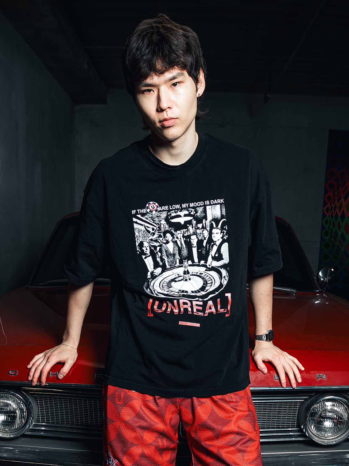 This oversized black tee features a bold, casino-inspired front graphic with high-contrast black, white, and red tones — bringing back the golden age of risk, style, and rebellion.